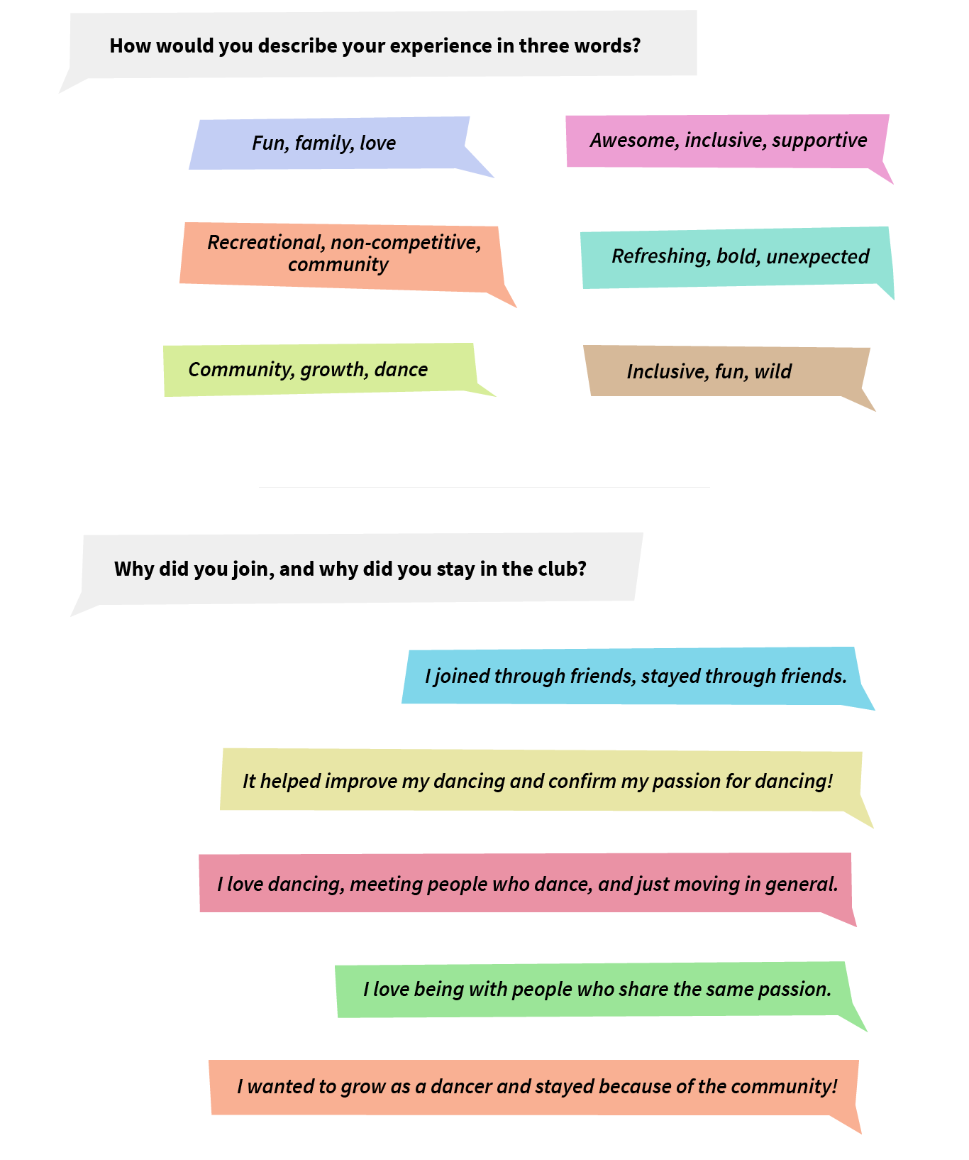 The dance club members shared a common interpretation of the club: its unity, its community, its non-competitive nature, and its members' passions for dance. After all, the club brought together students of such different backgrounds and interests. With this information in mind, we proceeded to iterate sketches for how the logo and branding would pan out.