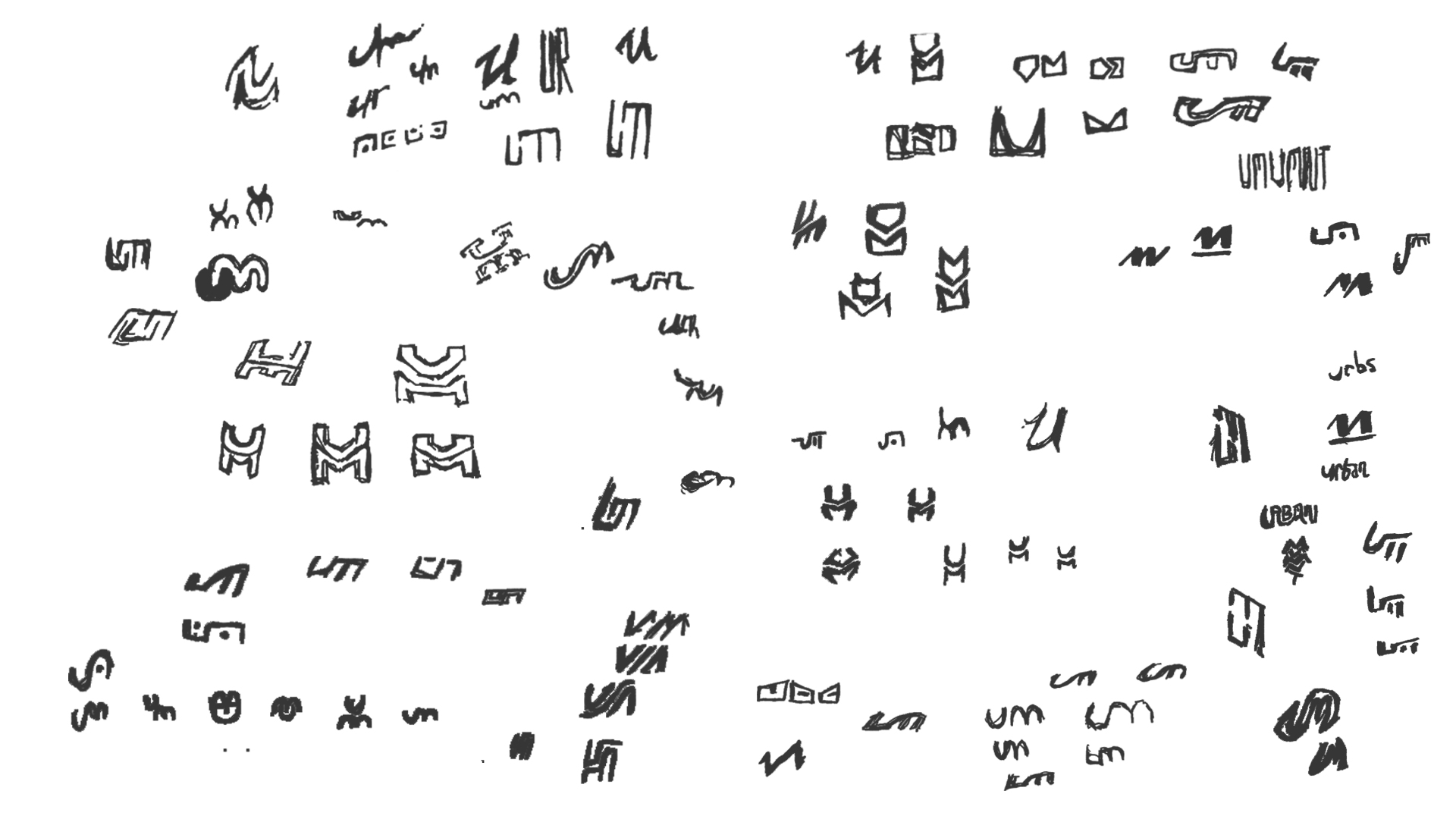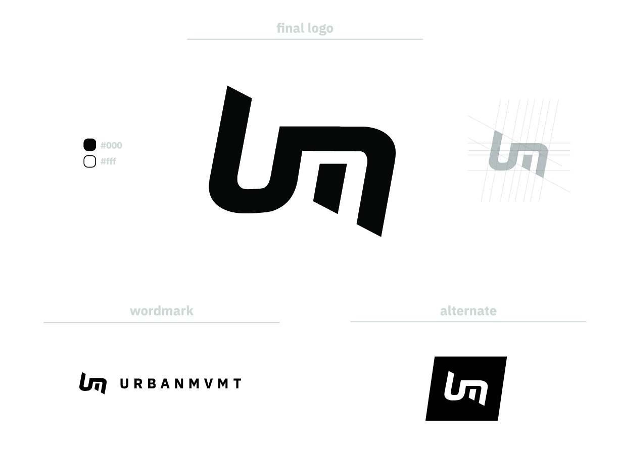 The following is the final iteration that we decided upon using. The branching roads curving towards the center represents the different backgrounds and paths of members prior to joining the club. The radial symmetry and the solid black/white coloring reflects the unity, community, and inclusivity of the club, bringing together the paths spiraling around. And of course, the letters "U" and "M" are merged together into a ligature symbol, representing the words "Urban Movement".