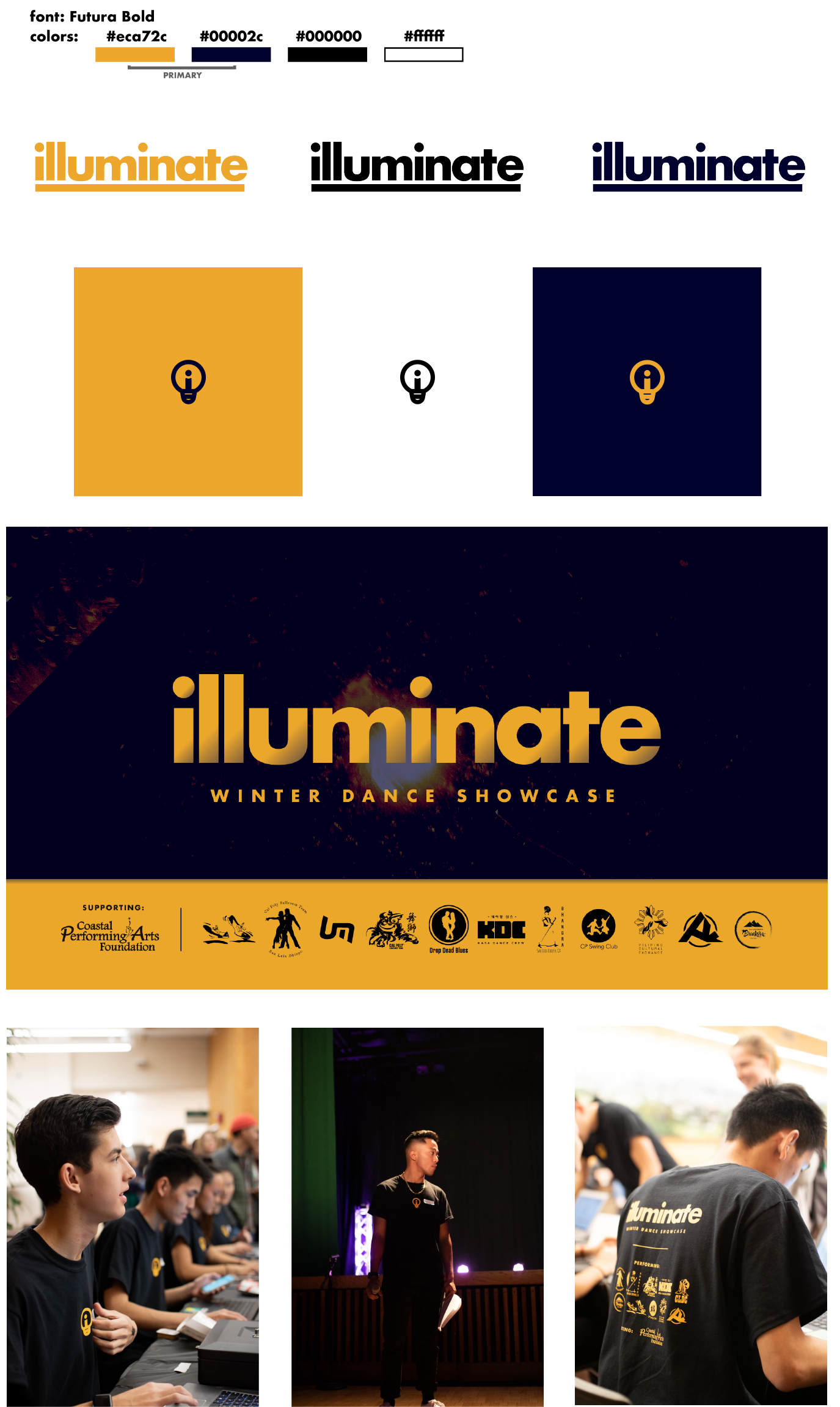 In addition to the normal schedule of practices and performances, Urban Movement decided to unite the entire the Cal Poly dance community through a winter dance showcase called "Illuminate". We wanted to bring the plethora of talent among the student body into the spotlight, ranging from Chinese Student Association's Lion Dance Team to the Cal Poly Ballroom Team. I designed new branding peripherals to give Illuminate a unique voice slightly removed from Urban Movement.
