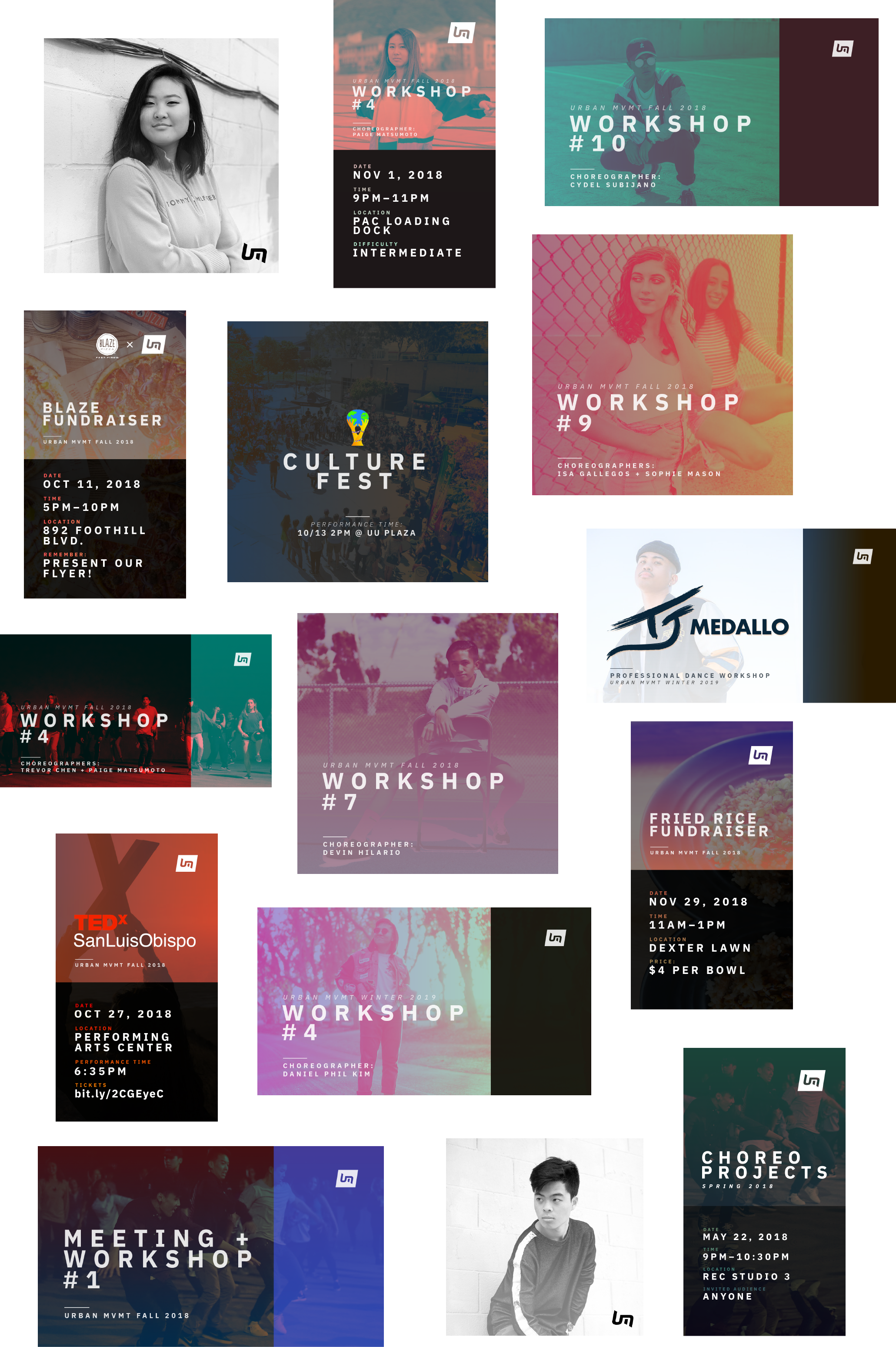Urban Movement is a non-audition dance club at Cal Poly San Luis Obispo. However, the club used to be called "Hip Hop Choreo Club", until it came under fire over social media for not properly "representing Hip Hop culture" and not responding "timely" to support the Black Student Union in Cal Poly's 2018 blackface incident. The name "Urban Movement" was created by the club's president as a better representation of the dance club as a part of urban dance culture, not hip-hop culture. As the creative director, I was tasked with Hip Hop Choreo Club's refresh and rebrand into its new identity.